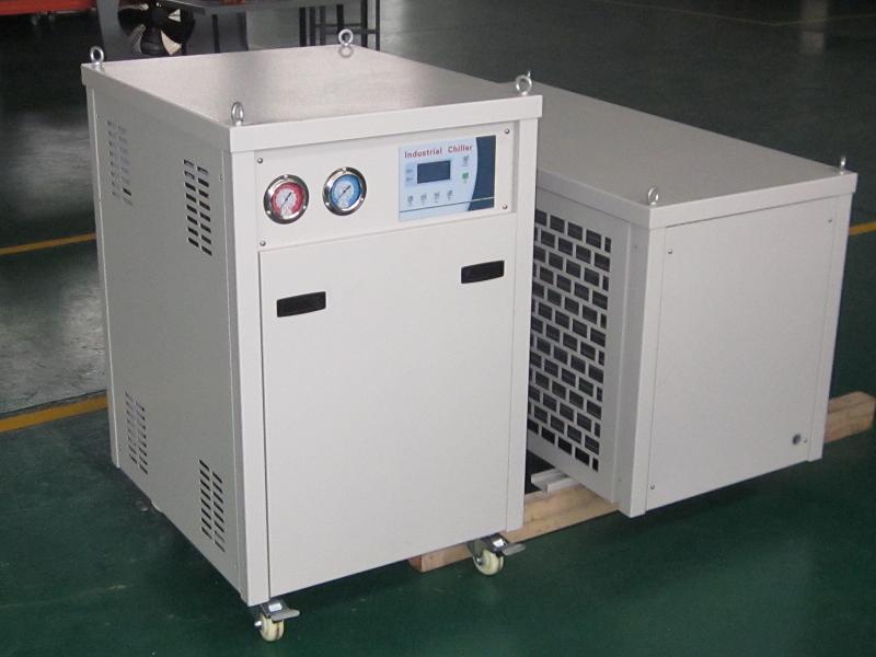 分體式冷水機由室內機和室外機組成,分別安裝在室內和室外,中間通過管路和電線連接起來的冷卻水循環設備。室內機主要包括蒸發器、溫度顯示控制器、蓄水水箱、循環水泵。室外機主要包括壓縮機、冷凝器、風扇。